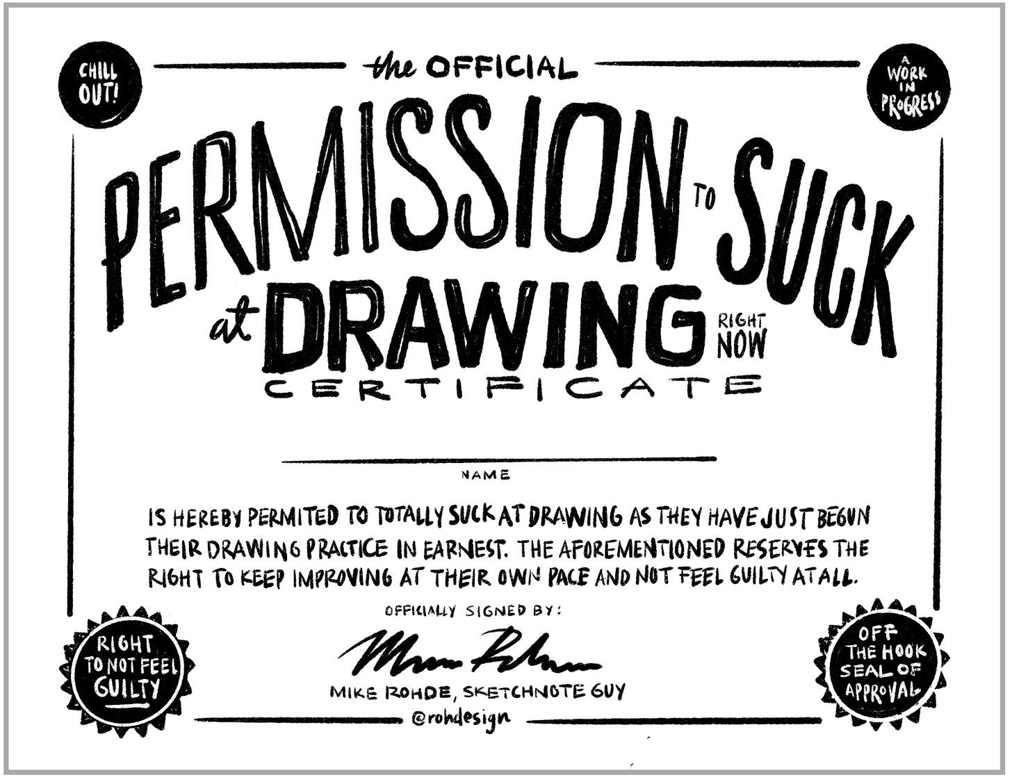 Don’t feel you're good at drawing? That’s where we all are! Here’s a PDF download of the Official Permission to Suck at Drawing Certificate! Download it, print it, add your name, and hang it up where you’ll see it when drawing as a reminder that it’s OK to suck at drawing. :-)