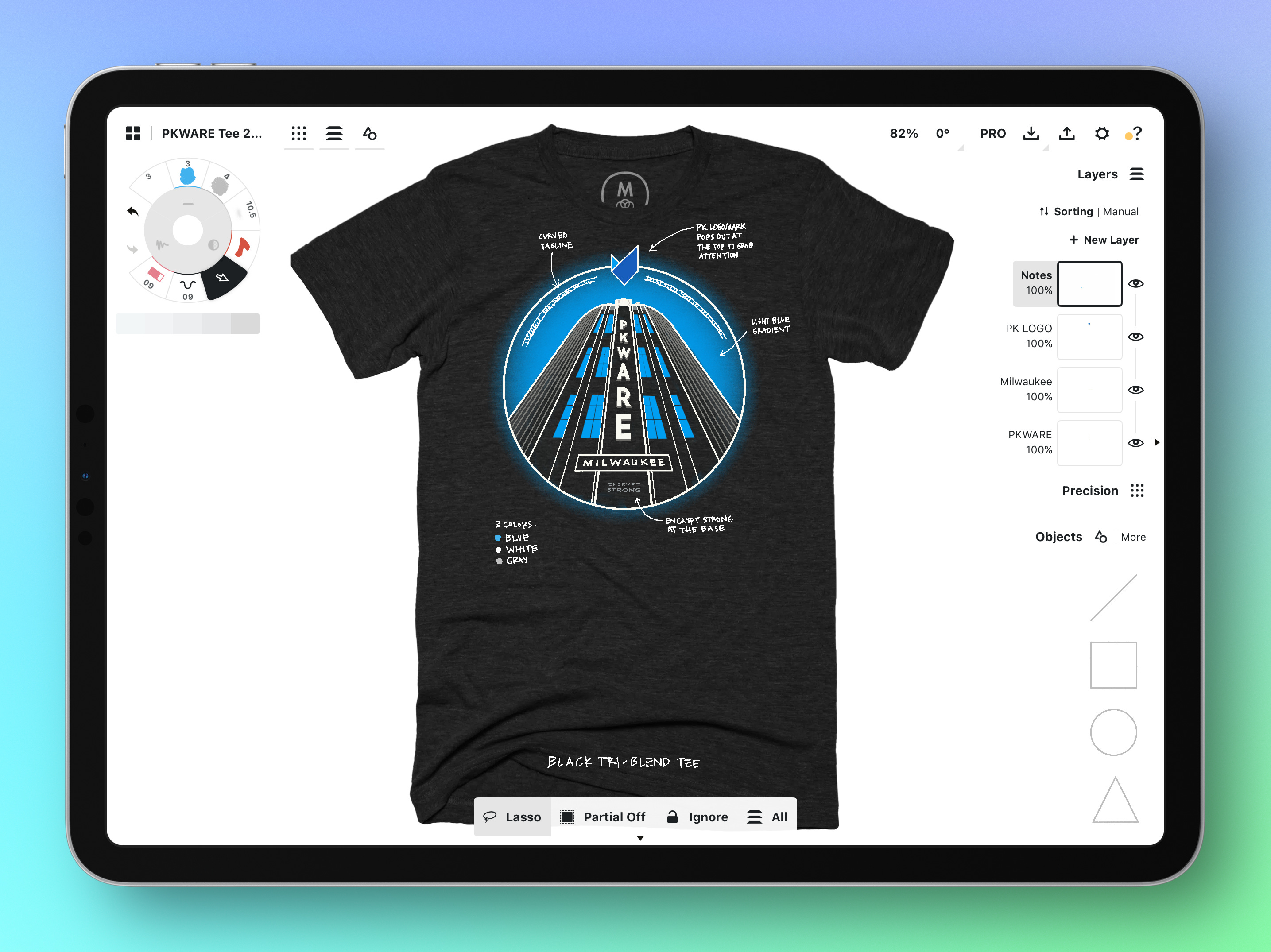 After exploring ideas on paper, I moved to Concepts on the iPad and started to sketchnote these ideas with details that were a bit closer to the final design, including a t-shirt base, colors, and notes: