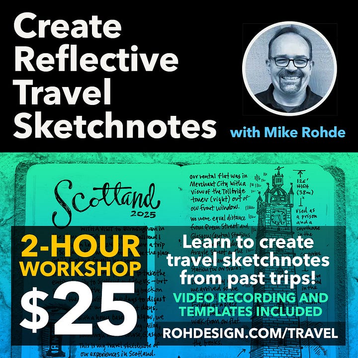 Check out my sketchnoting workshop videos to build your lettering, layout, and icon creation skills in your sketchnotes, or to learn my reflective method for creating travel sketchnotes from photos and memories after you return home from your trip: