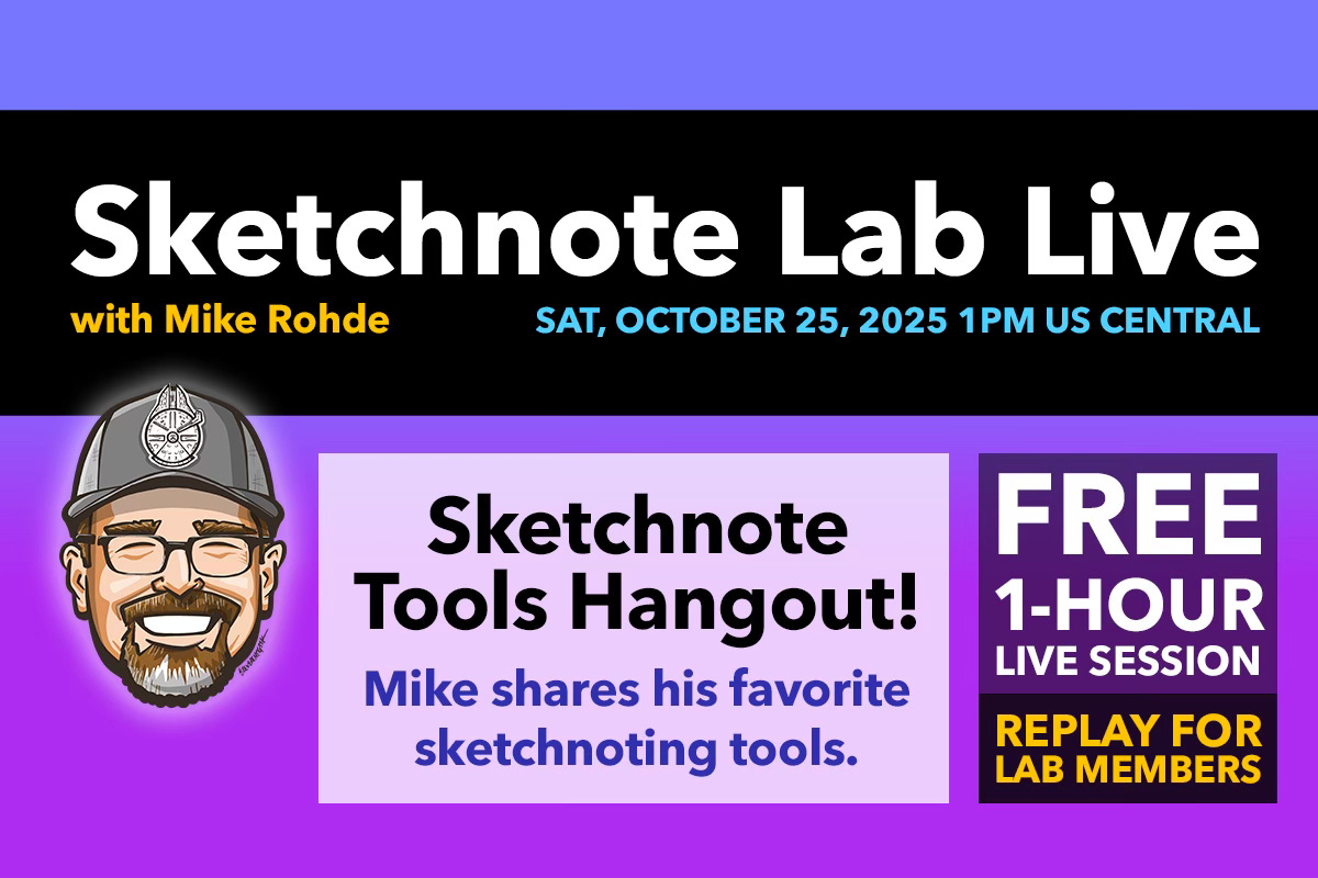 Sketchnote Lab is Mike Rohde’s space designed to bridge the gap between sketchnote theory and practice. The goal is to guide you in integrating sketchnoting into your everyday life. Learn more about Sketchnote Lab.