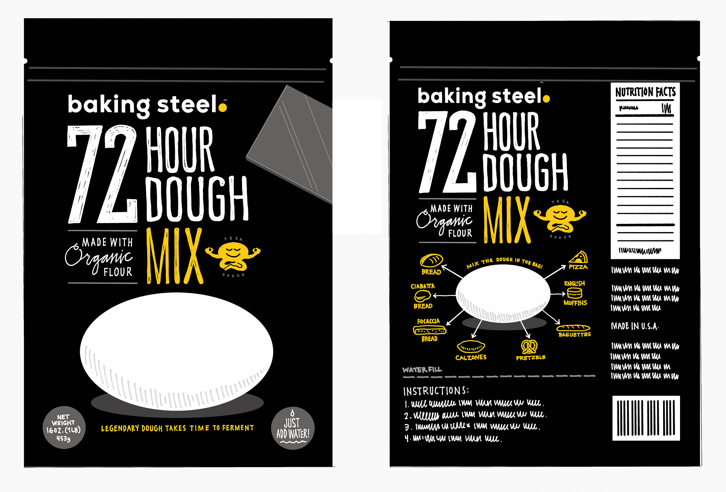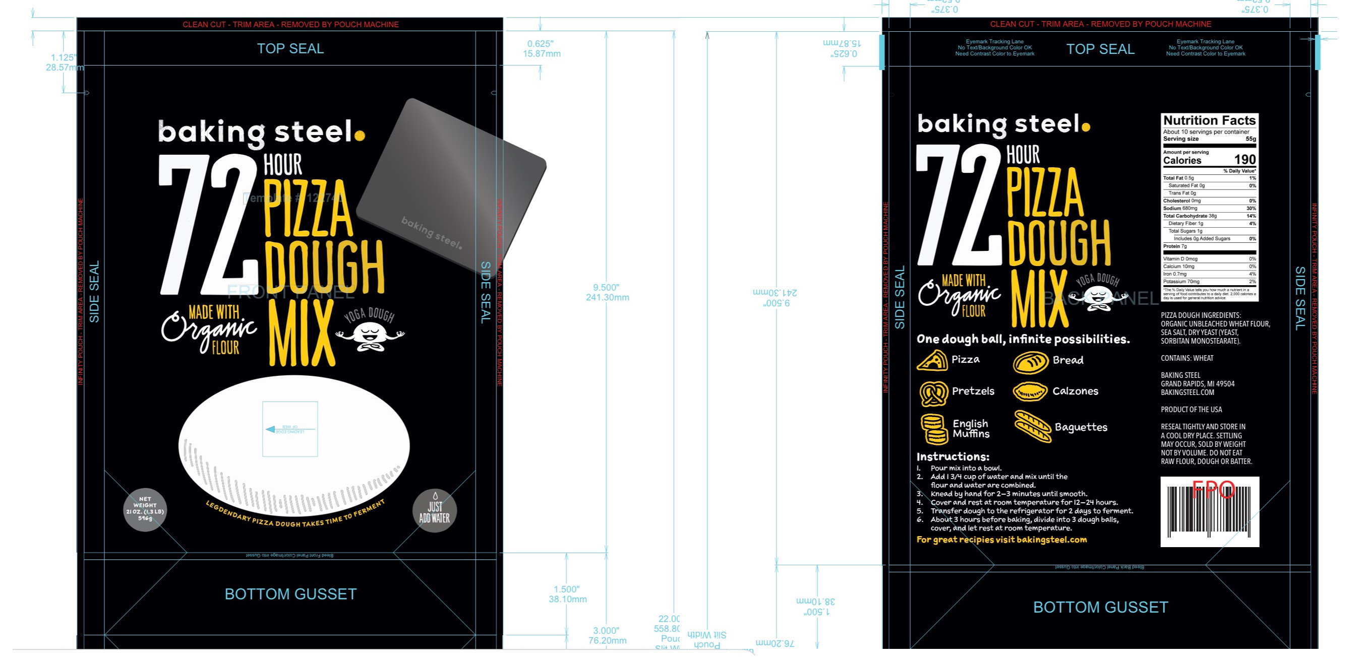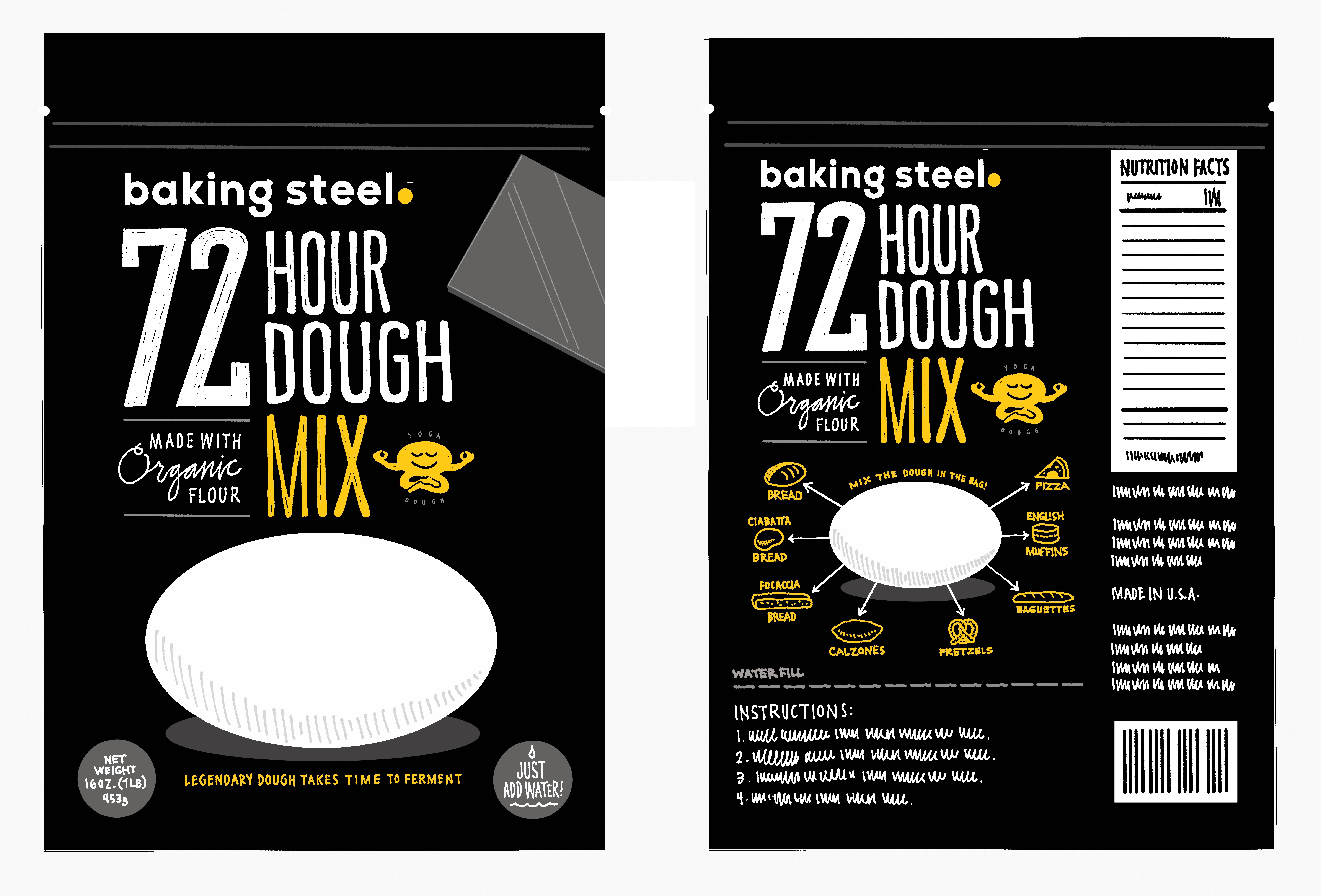 Andris Lagsdin of Baking Steel needed packaging for his 72 Hour Pizza Dough mix, a product he created around his popular recipe for pizza dough. He loved the idea of making this mix accessible to anyone who wants to make pizza by just adding water.